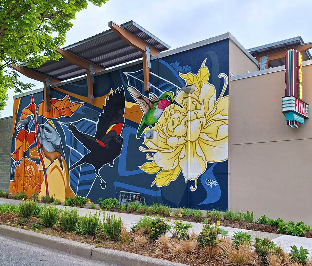 Even in urban environments, we are surrounded by birds, flowers, trees and animals that adapt and thrive along with people. I have a passion for creating work that incorporates local native species with a bold color palette to highlight the importance of finding ways to live in balance together.
