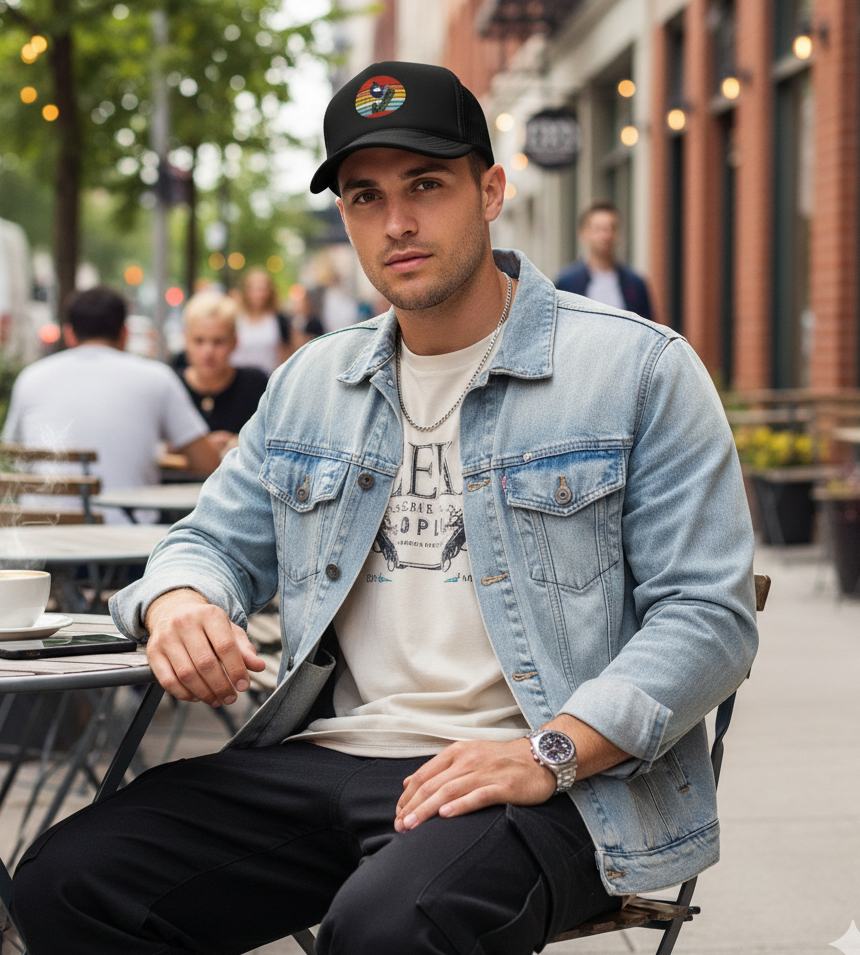 Bring vintage outdoor vibes to your everyday look with this Retro Bird Trucker Hat. Featuring a bold graphic of a mountain chickadee perched against a retro sunset stripe background, this mesh-back snapback blends style, comfort, and nature-inspired design.