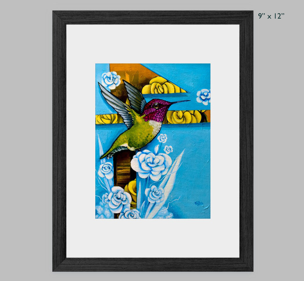 This painting started with the hummingbird. They move so fast that most of the time you only catch a blur, but when you slow down and really look at one, the colors and details are wild. I wanted to mix that feeling with the idea of time passing in layers. That’s where the roses and cut-out shapes come in… little snapshots, almost like pieces of different moments stacked together.