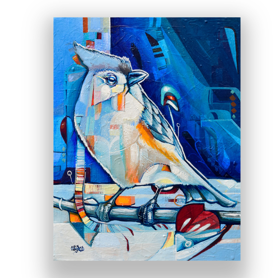 The Time of Reflection captures a quiet moment we all recognize...that pause where everything softens and the mind finally settles. This little bird, painted in cool blues and soft orange tones, feels fully present, perched in a world of layered shapes and shifting light.