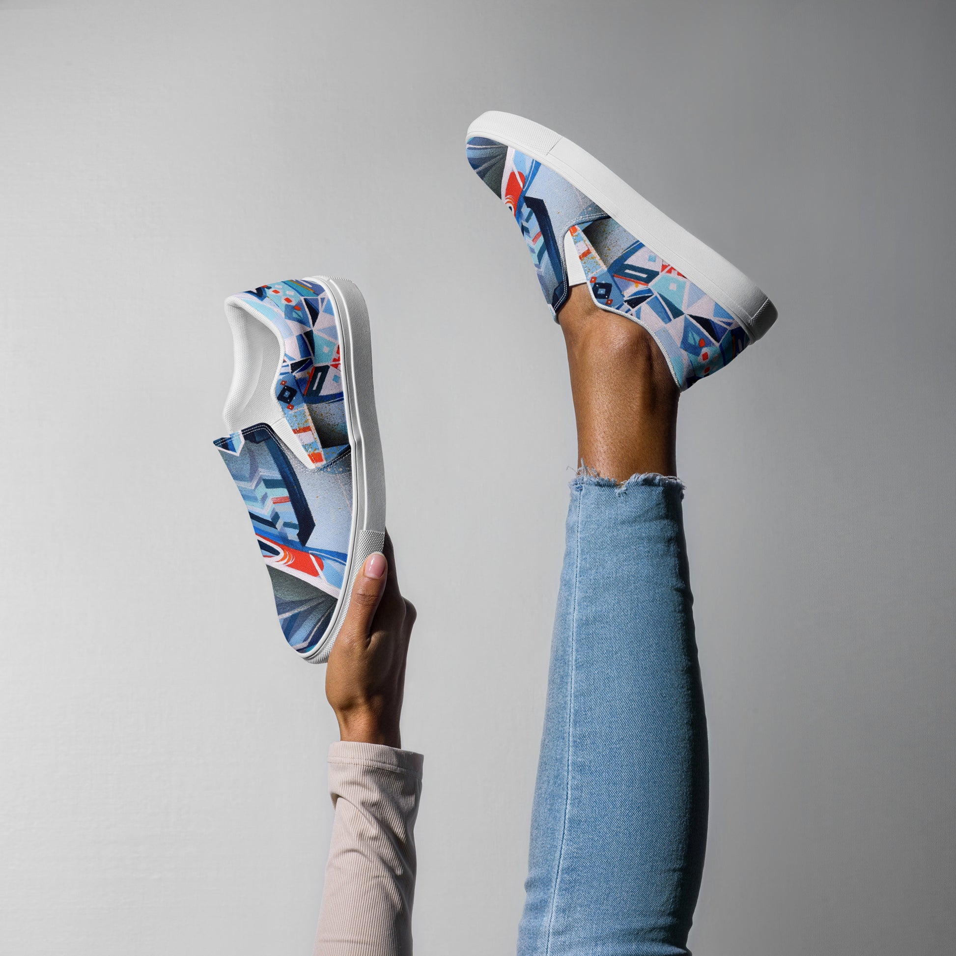 Step into art you can wear. These slip-on canvas shoes feature an original John Osgood design inspired by the rhythm of cityscapes and the harmony of movement. The bold geometry and layered blues evoke motion and depth, accented with vibrant pops of red and orange that give each step energy and style.